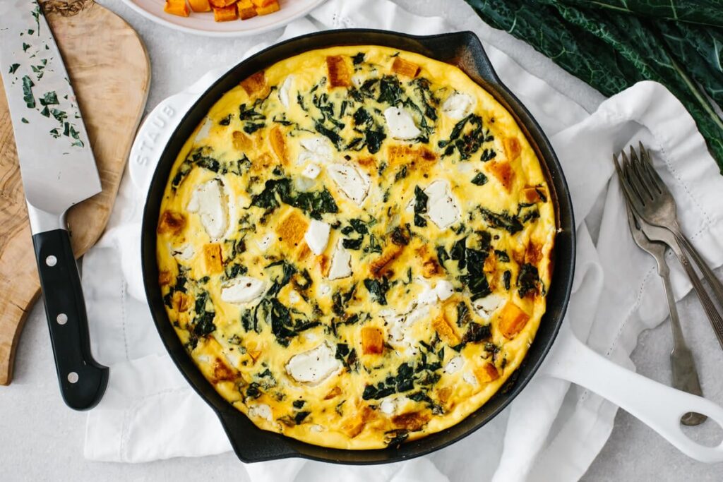 You will need 1 cup diced squash, 2 cups kale, 6 eggs, one-half cup grated Parmesan, and 1 tablespoon olive oil. Garlic, salt, and pepper are necessary for seasoning. Optional: add crumbled feta or goat cheese for extra flavor.
