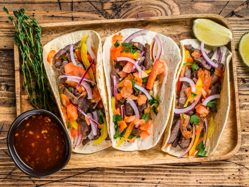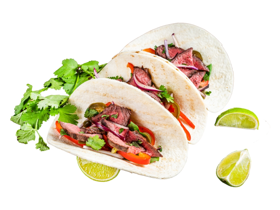 Marinate 1 and 1 half pounds flank steak in 2 tablespoons oil, 2 tablespoons lime juice, 2 minced garlic cloves, 1 teaspoon cumin, 1 teaspoon chili powder, and 1 teaspoon salt for 30 minutes. Grill or sear the steak for about 4 to 5 minutes per side for medium, then let it rest for 10 minutes before slicing it into small pieces. Fill 10 warmed corn tortillas with the beef, 1 half cup chopped onion, and 1 half cup chopped cilantro. Serve with lime wedges and salsa roja on the side.