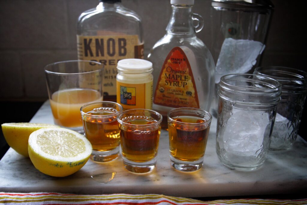 You’ll need 2 ounces bourbon, 4 ounces apple cider, and 1 teaspoon maple syrup. Add a cinnamon stick and orange peel for garnish.