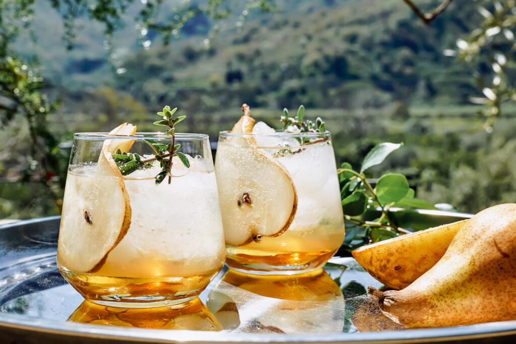 You’ll need 3 ounces pear juice, 4 ounces prosecco, and ½ ounce cinnamon syrup. Add thin pear slices for garnish.