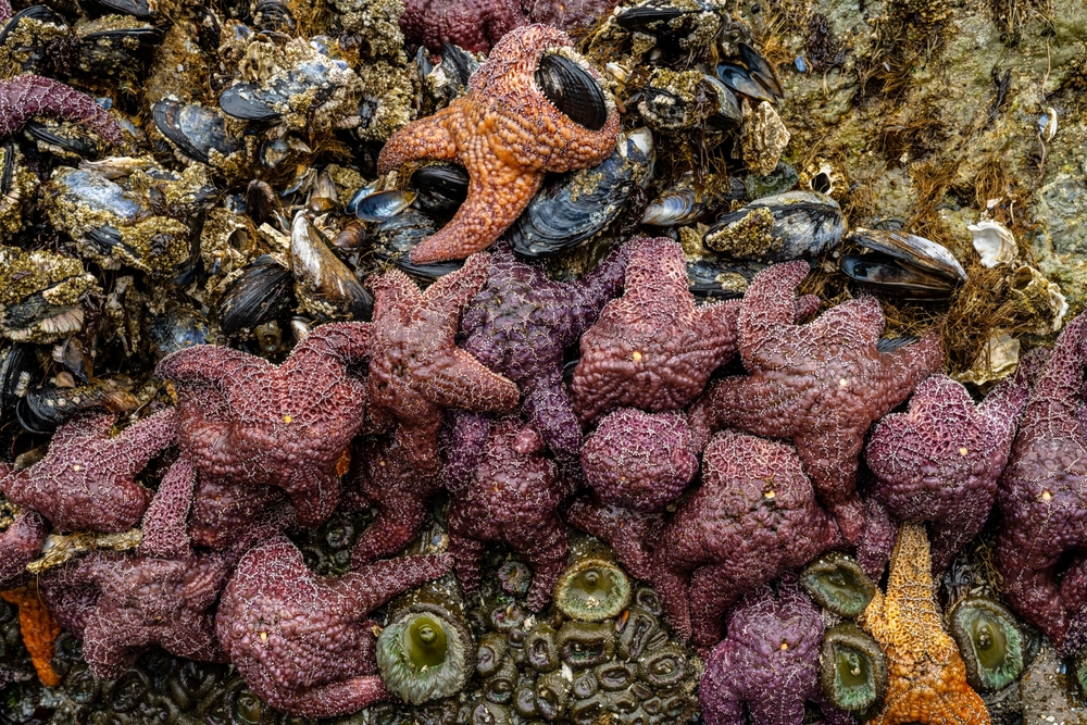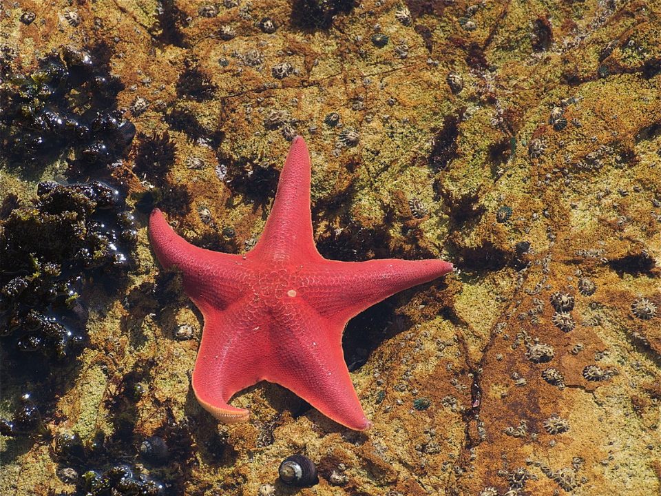 At first glance, it may look like a simple star resting flat against the rock. A closer look shows why people wait for the right tide, since waves and foam can hide its full shape when the water is higher. It is also important in tide pools because it feeds on animals like mussels. That feeding habit can affect which other animals have room to live nearby.