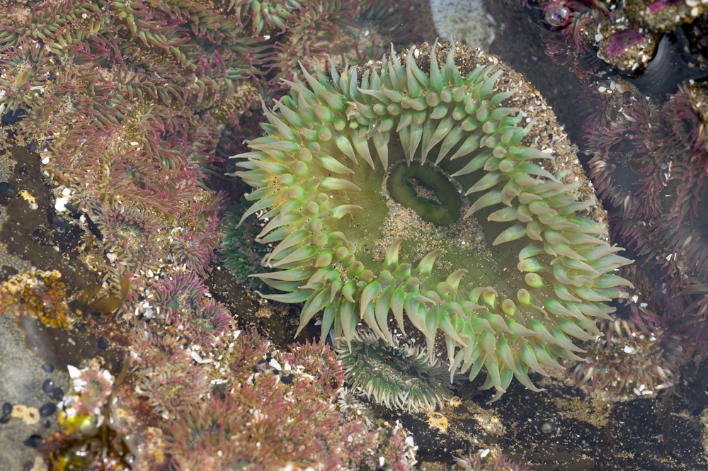 The giant green anemone can look like a glowing flower fixed to stone. It shows well only when the water drops enough for its tentacles to spread out without too much wave action above it. This animal is native to the Pacific coast of the United States, Canada, and Mexico. Many people think of it as one of the classic sights of a West Coast tide pool.