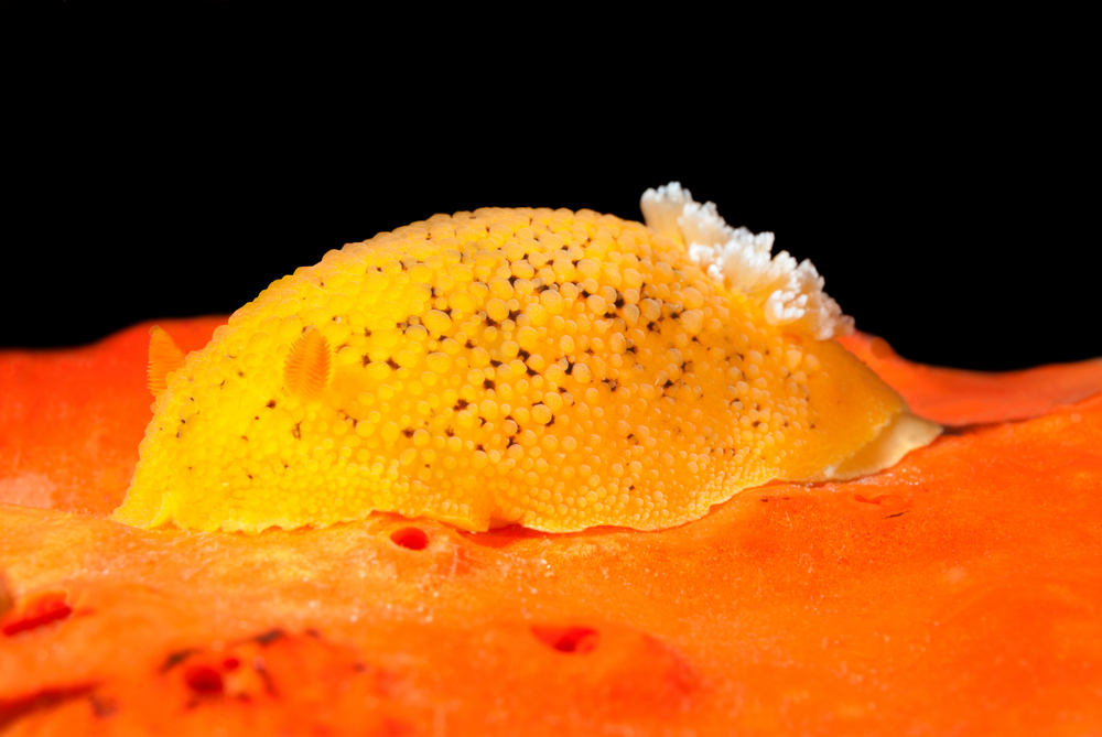 Bright against darker rock, the sea lemon nudibranch often shows best when the tide uncovers lower pools and wet surfaces. Even a small change in tide height can matter because it usually lives in the low intertidal zone or just below it. This animal is native to the United States, Canada, and Mexico along the eastern Pacific coast. Its color can range from yellow to orange, which helps it stand out when the pool is calm.