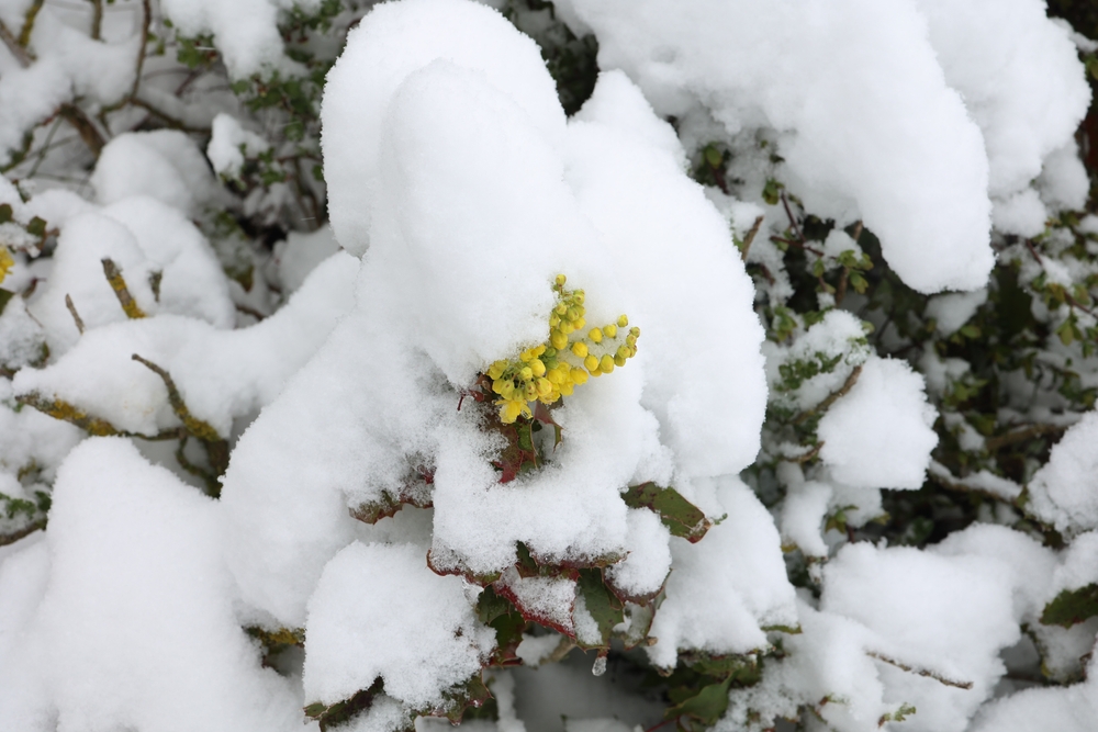 Mahonia, also known as Oregon grape, is a shrub that produces vibrant yellow flowers in the middle of winter. These flowers are often followed by blue-black berries, which are edible and attract birds to the garden. Mahonia’s ability to withstand frost and snow is due to its thick, leathery leaves and its antifreeze-like compounds that protect it from freezing temperatures. The flowers add a bright burst of yellow to the winter landscape, while the plant’s evergreen leaves provide structure and interest throughout the year.