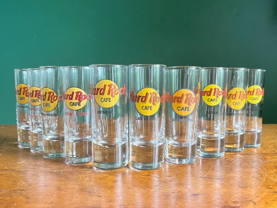 Lined up on bar carts or kitchen shelves, souvenir shot glasses have been a travel classic for years. Hard Rock Cafe is a strong example here because location drinkware has long been part of its merchandise identity. These glasses are usually made of thick glass, though novelty versions may use ceramic, metal, or printed finishes.
