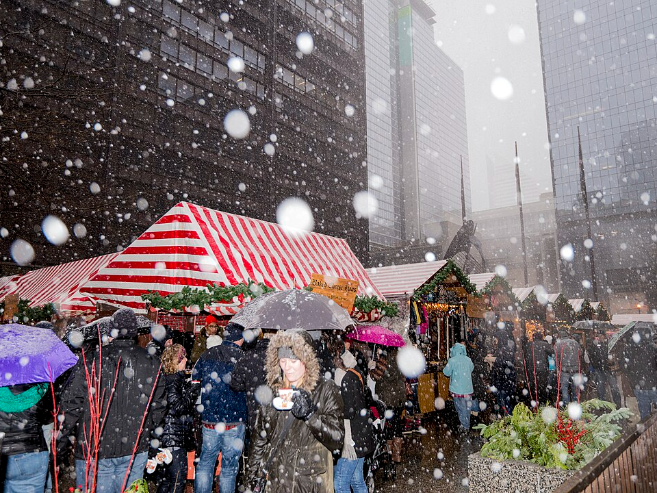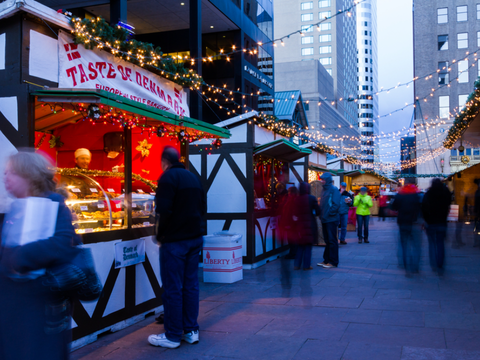 Denver hosts a festive market that celebrates European holiday traditions and offers a large variety of seasonal goods. Wooden vendor huts line the area and create a welcoming outdoor shopping space filled with warm treats and handmade gifts. Visitors enjoy sipping warm drinks as they walk from booth to booth during the crisp December air.