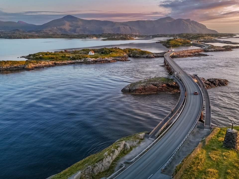 Norway’s Atlantic Highway, known as the Atlanterhavsveien, is a scenic drive connecting the mainland to the island of Averøy. This route is famous for its dramatic bridges that connect small islands and its striking views of the Atlantic Ocean.