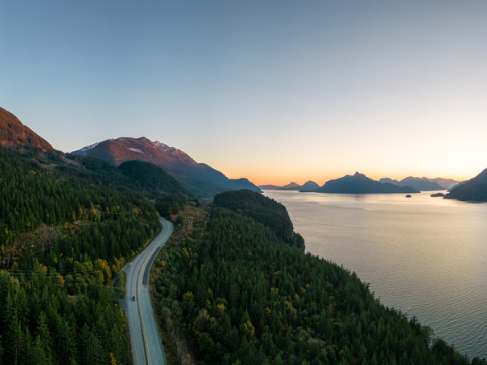 The Pacific Coast route through British Columbia offers a scenic drive filled with lush forests, coastal fjords, and rugged mountains. This route stretches from the city of Vancouver up to the southern border with Alaska, providing views of the Pacific Ocean along the way.