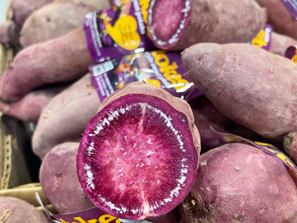 Magic Molly potatoes have a striking deep purple skin with dark purple flesh that maintains its color during roasting. These potatoes are known for their rich and slightly sweet flavor, which intensifies when roasted. The flesh has a smooth, creamy texture, making it ideal for roasting to bring out its natural sweetness.
