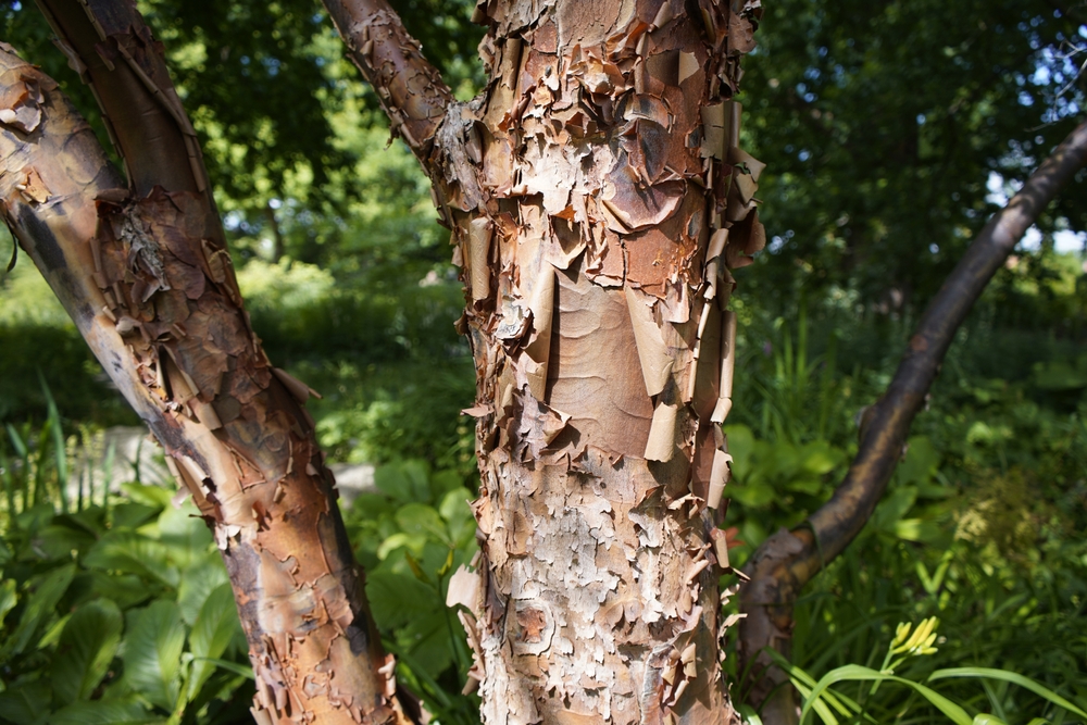 The Chinese Paperbark Maple is a small to medium-sized tree known for its distinctive, exfoliating bark. The bark peels away in thin, curling layers, revealing rich cinnamon-brown and orange tones beneath. Native to China, this tree thrives in temperate climates and prefers well-drained soil and moderate rainfall. Its bark pattern resembles delicate, curling sheets of paper, making it stand out in both winter and summer landscapes. The smooth texture of the bark enhances its appeal.