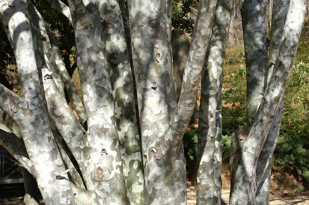 Crape Myrtle is a well-known ornamental tree with smooth, multi-colored bark that peels off in thin, paper-like layers. This tree’s bark transitions from shades of gray and brown to light cream and cinnamon hues, creating a soft, artistic effect. Originally native to Asia, Crape Myrtle flourishes in warm, humid climates and is often seen in gardens and public spaces. As the tree matures, the bark continues to reveal a patchwork of colors, making it an attractive feature year-round.