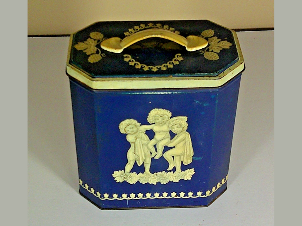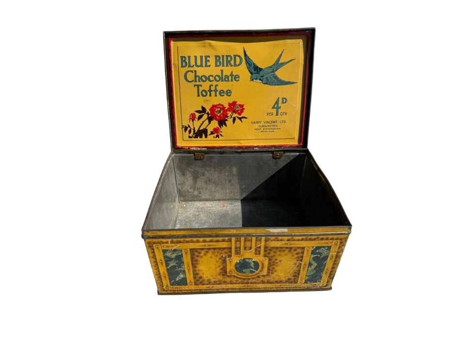 Blue Bird Toffee tins from England featured rich illustrations of birds, countryside scenes, and sweet treats. The designs are loved for their warmth and artistic detail, making them display-worthy pieces of vintage confectionery packaging.