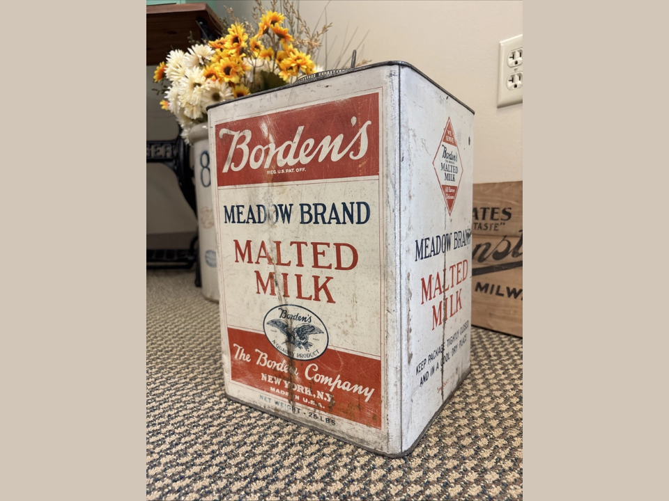 Borden’s Malted Milk tins are a favorite among collectors who appreciate nostalgic grocery advertising. With their cream-colored bodies and red script, they captured the wholesome image of early 20th-century family nutrition.