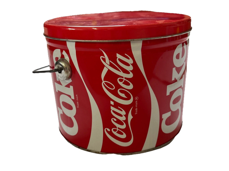 This vintage Coca-Cola tin captures the spirit of old soda shops with its vivid red color and elegant cursive script. The design evokes nostalgia for the 1940s and 1950s, when Coca-Cola used clean, confident branding that stood out in diners and vending machines.