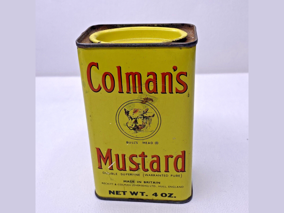 The bright yellow Colman’s Mustard tin is an unmistakable icon from British advertising history. Its proud bull’s head emblem and bold lettering communicate strength and tradition, dating back to the Victorian era.