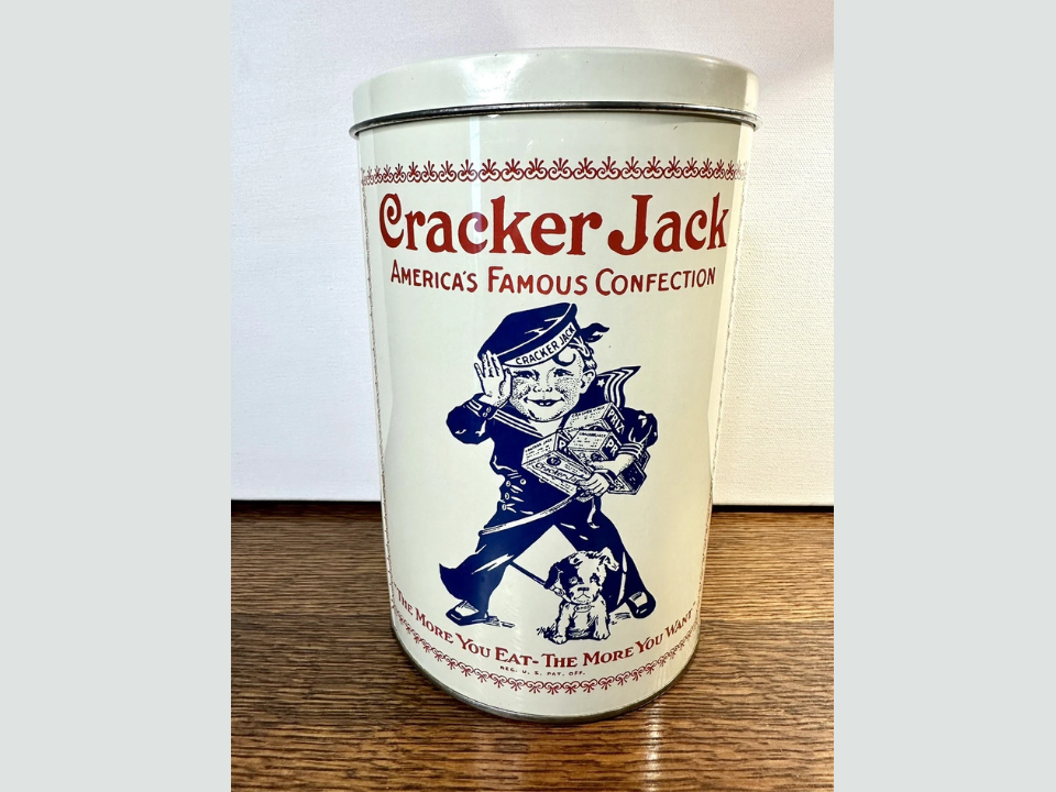 The Cracker Jack tin brings to life early 20th-century carnival fun with its nautical theme and animated boy mascot. Its design, full of reds and blues, mirrors the playful spirit of the brand’s early prize-filled popcorn boxes.