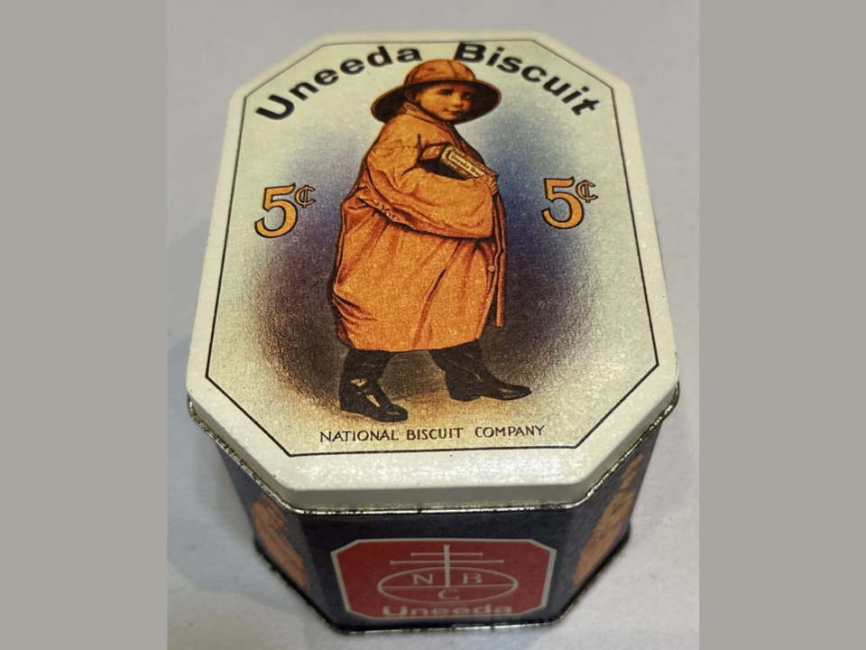 This tin played a vital role in American marketing, combining a character and slogan to create brand recognition. Today, authentic Uneeda tins are valued between $120 and $250, especially when featuring clear lithographs.