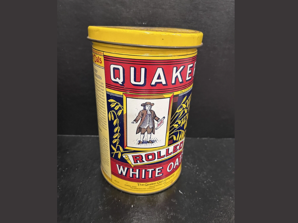 Quaker Oats tins from the early 1900s remain prized for their pastoral artwork and early branding appeal. The image of the Quaker man was printed in deep blue and white, exuding calm reliability and trust during the turn of the century.