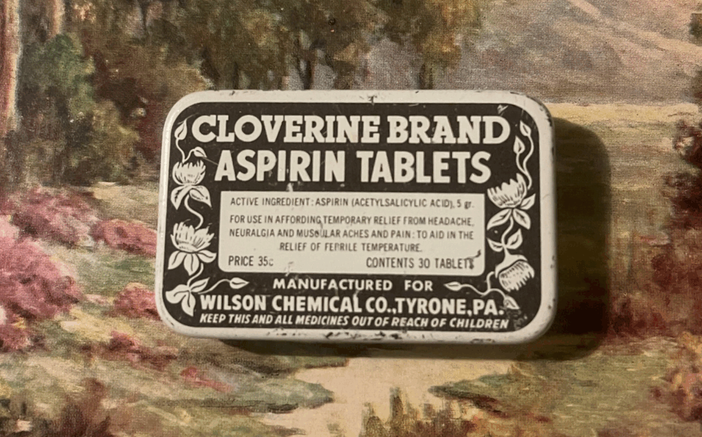 This vintage Cloverine Aspirin tin, produced during the 1940s, features a simple yet striking design with a green and yellow color scheme. The tin was used to store aspirin and other medicinal products. It represents a time when packaging was as much about advertising as it was about functionality. A mint-condition Cloverine Aspirin tin can be worth $80 to $250 on the market. The historical significance of the product and its branding make this a valuable find for collectors.