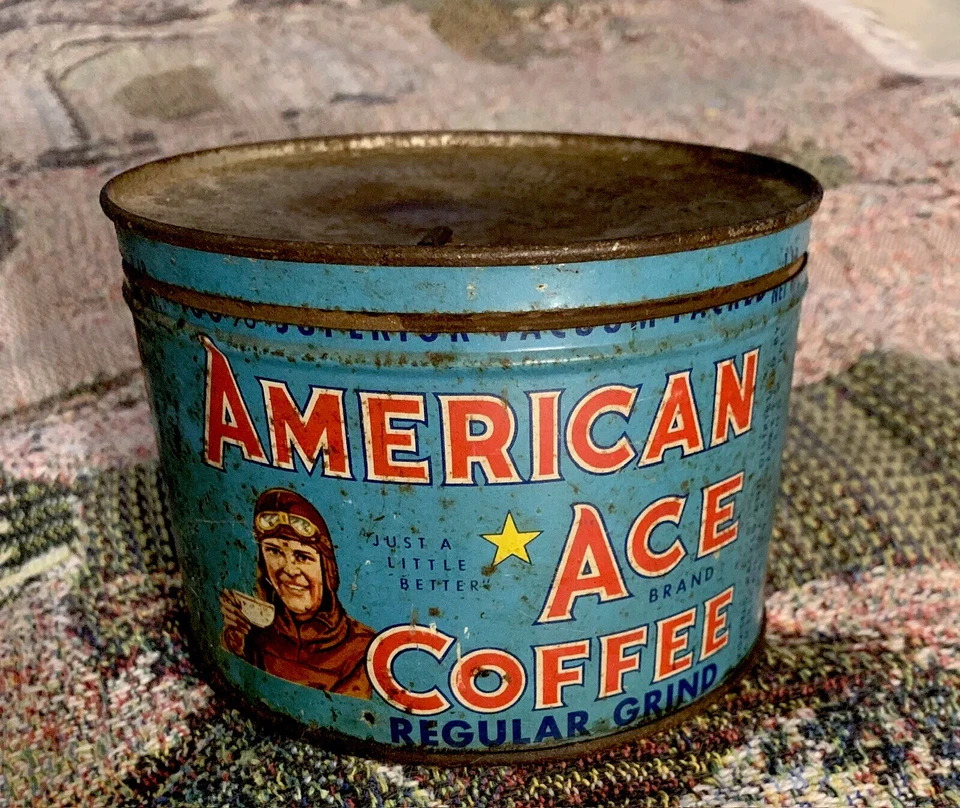 The American Ace Coffee tin holds historical significance as it was produced for the military during World War II. Its design, featuring strong patriotic imagery, captures the spirit of the era. These tins are often seen as symbols of American wartime resilience and pride. Because they were produced in limited quantities, the tins have become rare finds, especially in good condition. Collectors value these tins for both their historical connection and their visual appeal.