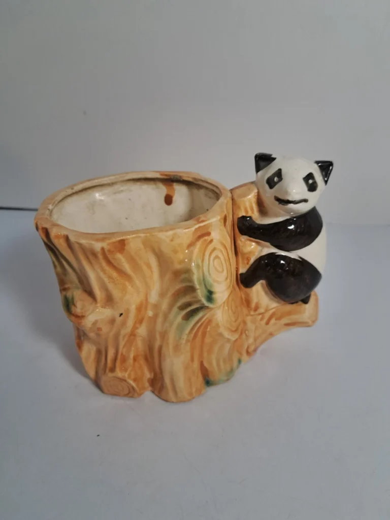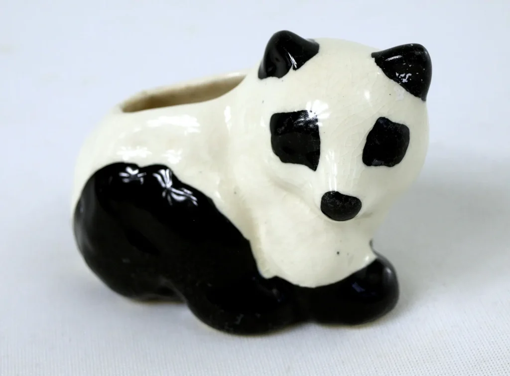 This high-gloss panda planter gleams under light, showing off the deep black glaze against bright white ceramic. The shiny surface gives it a newer look while keeping the vintage shape. It’s slightly larger than earlier Japanese pieces, making it more practical for small houseplants. Collectors enjoy its mix of whimsy and polish.