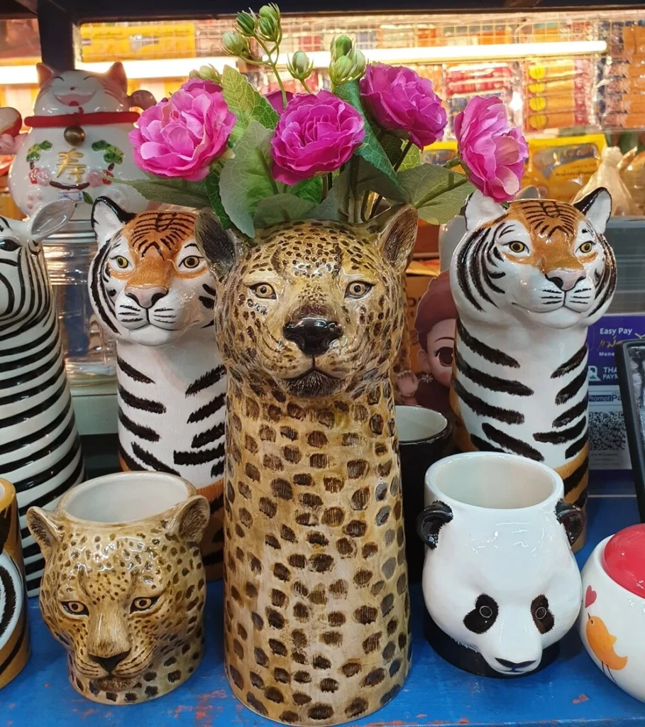 Because of its weight and shape, it’s ideal for larger indoor plants or dried arrangements. The lion motif gives a regal air, perfect for pairing with rich fabrics or dark wood accents. In a collection, it stands out as the bold centerpiece among softer ceramic companions. It’s a favorite among decorators who love vintage metalwork.