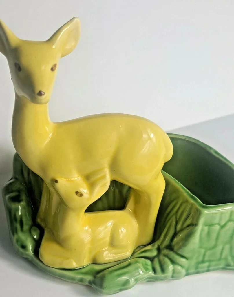 This colorful fawn planter stands out with its rich yellow and burgundy glaze. Touches of gold highlight the ears and eyes, giving it a slightly glamorous edge. It’s both rustic and elegant, a combination typical of mid-century pottery. The gentle pose adds a calm note to any display.