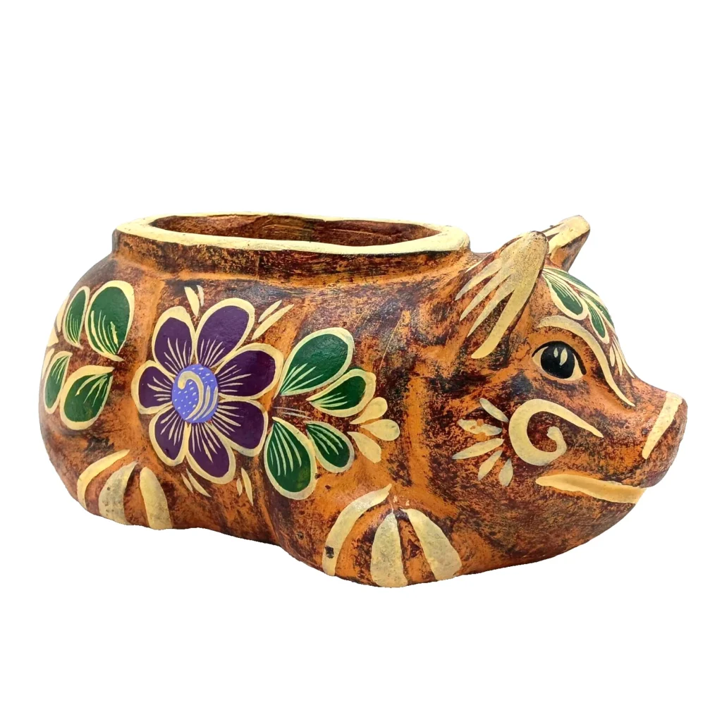 The pig looks especially cute with small leafy plants or herbs. You can use it indoors or on covered patios for a touch of country warmth. Its slightly porous clay helps soil breathe, which plant lovers appreciate. This little pig adds heart to any vintage collection.