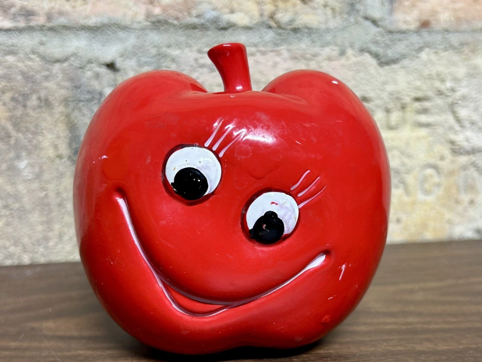 This apple-shaped planter features an expressive face with rosy cheeks and bright eyes. Its glossy red finish and attention to detail give it a warm and inviting appeal.