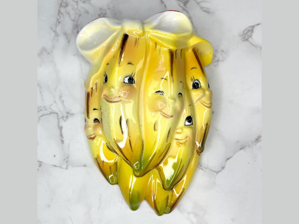 This quirky planter features a smiling banana with exaggerated facial features and a glossy yellow finish. Made in Japan during the 1950s, it captures the kitschy charm of mid-century kitchenware and décor.