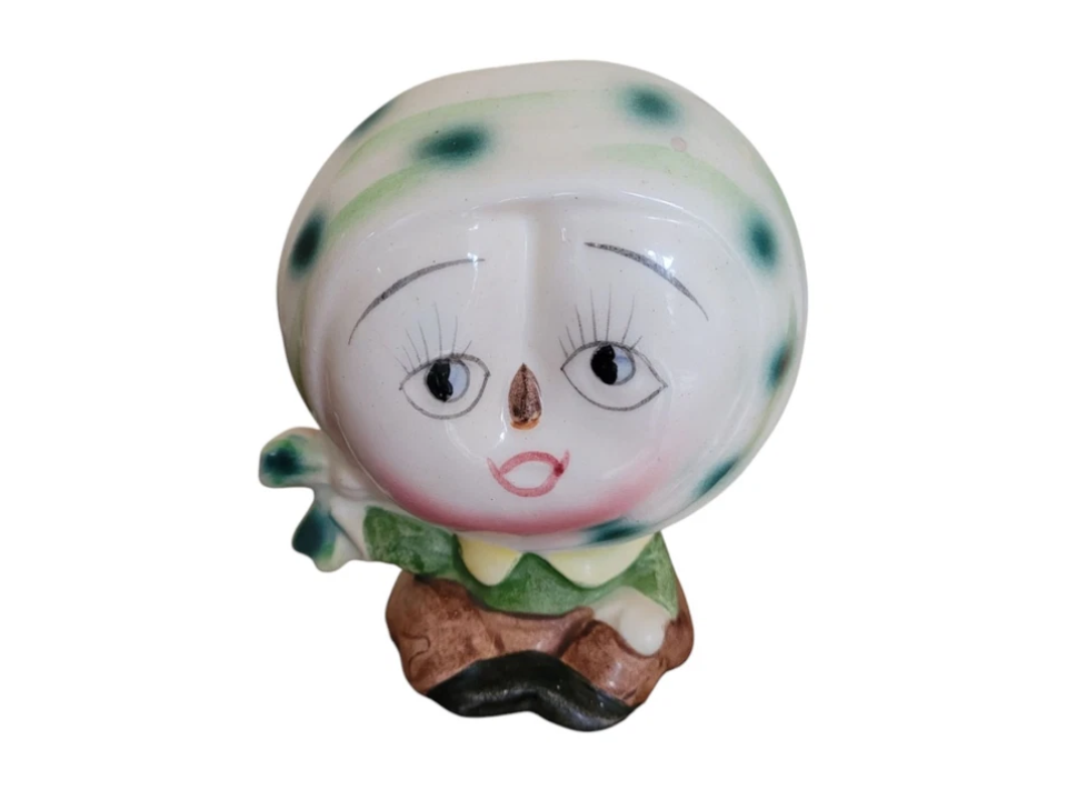This adorable peach planter has a smiling face and wears a red and white polka dot headscarf. The expressive features and hand-painted details make it a favorite among collectors of anthropomorphic ceramics.