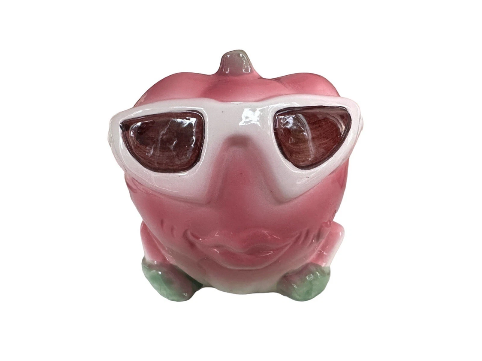 This fun planter features a fruit character wearing black sunglasses, giving it a cool and playful look. Made in Japan during the 1950s, it was designed with bright hand-painted colors and smooth ceramic glazing.