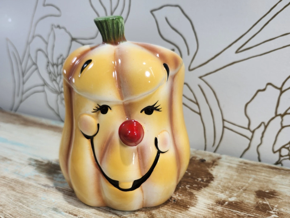 This charming planter is shaped like an orange with a smiling face and small green leaves at the top. Crafted in Japan during the 1950s, it reflects the cheerful style of mid-century kitchen décor.