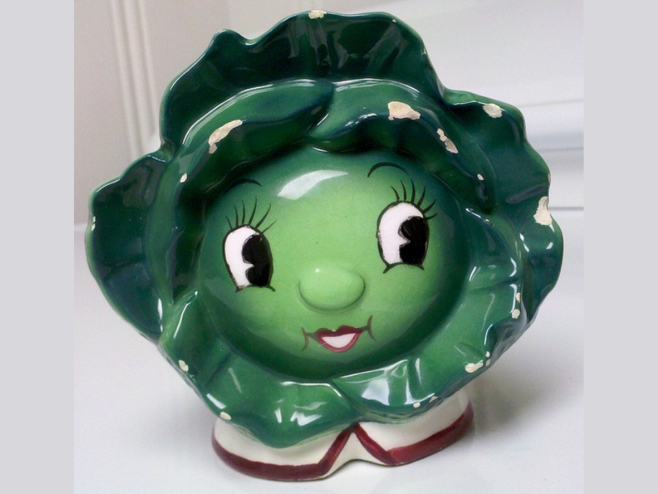 This charming planter showcases a cabbage with a smiling face, complete with big eyes and a red bow tie. Crafted by PY/Miyao in Japan during the 1950s, it’s a delightful example of mid-century kitsch. The planter’s vibrant green glaze and whimsical design make it a standout piece in any collection.