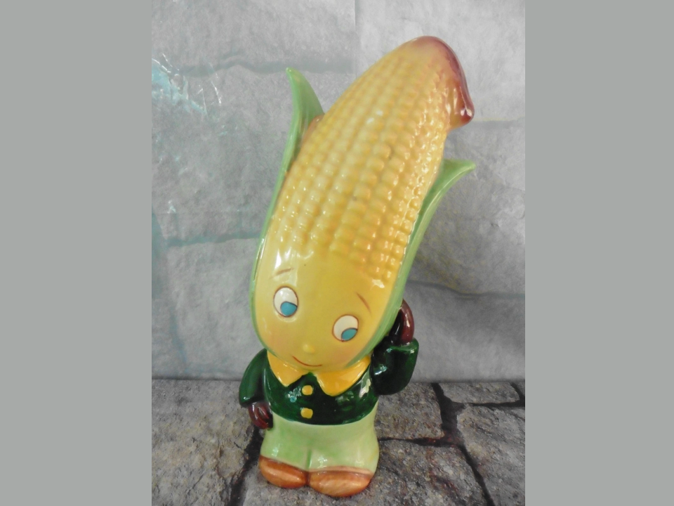 This planter is designed as a corn cob with a smiling face and detailed green husk accents. Made in Japan during the 1950s, it was part of a larger series of anthropomorphic vegetable-themed ceramics.
