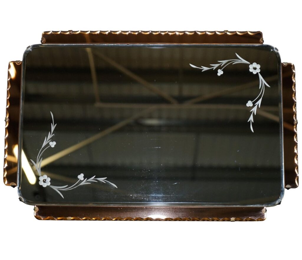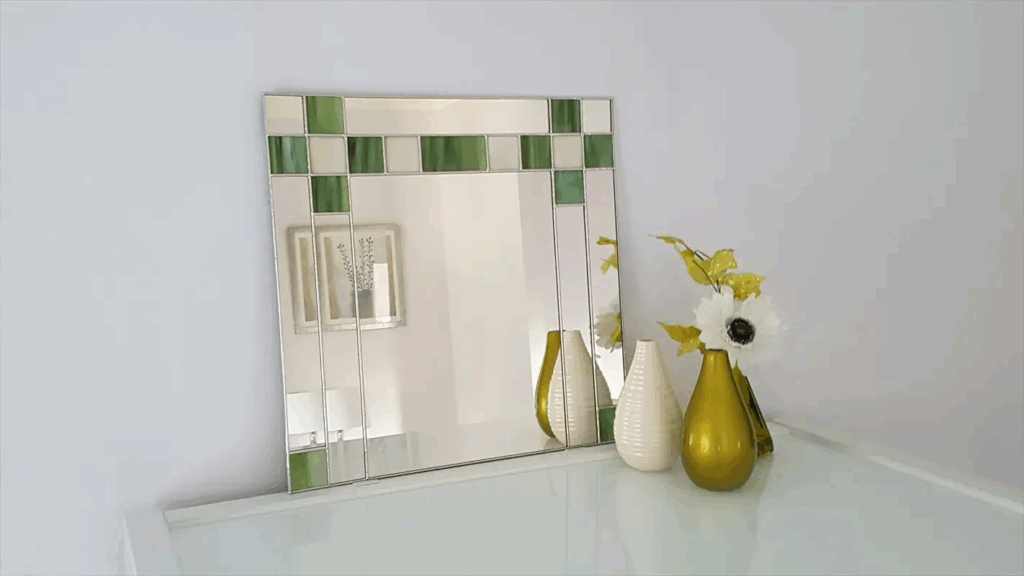 By mid 1930s, squares with small inset tiles delivered a tidy grid effect. Each corner may carry a tiny mirrored square that adds rhythm. The main plate is usually thick with a shallow bevel. Many pieces came from British makers and carry paper labels. Market prices often range from $500 to $1,000.