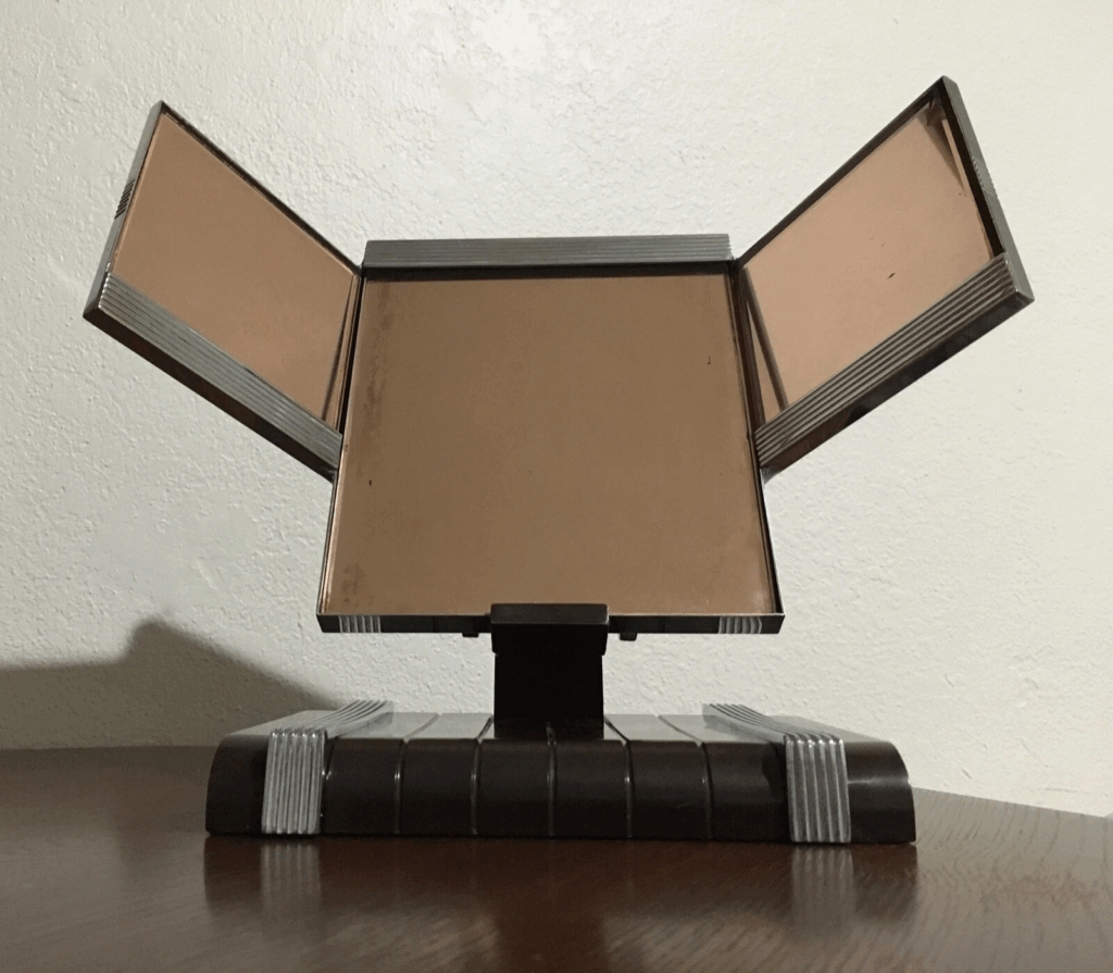 From mid 1920s salons came folding vanity mirrors with fan shaped tops. Hinged wings let users adjust angles for makeup and jewelry. Frames are often chromed brass with subtle step details. Silvering sometimes shows light freckles that read as period charm. Price estimates run about $500 to $1,200 based on size and clarity.