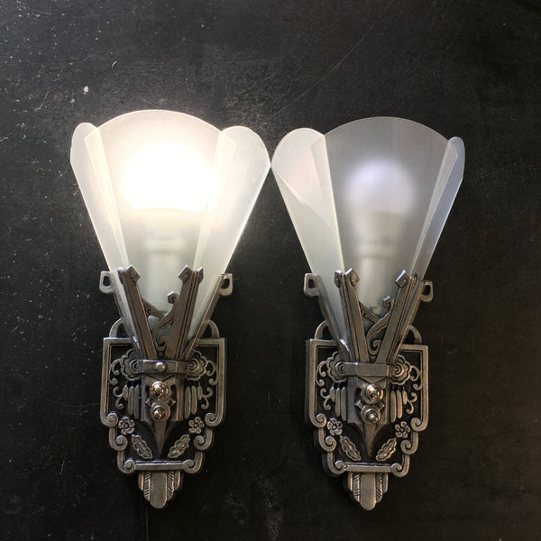 The blend of geometric and floral motifs creates a stunning visual contrast, making them a perfect addition to various home decors. Ideal for vintage-inspired spaces, these sconces add a sense of luxury and style without overwhelming the room. They also offer practical use by providing ample illumination for small to medium-sized spaces. Given their exceptional quality and restored condition, these sconces make a perfect fit for collectors and homeowners alike. Their continued demand speaks to their enduring appeal, making them a great investment for any Art Deco enthusiast.