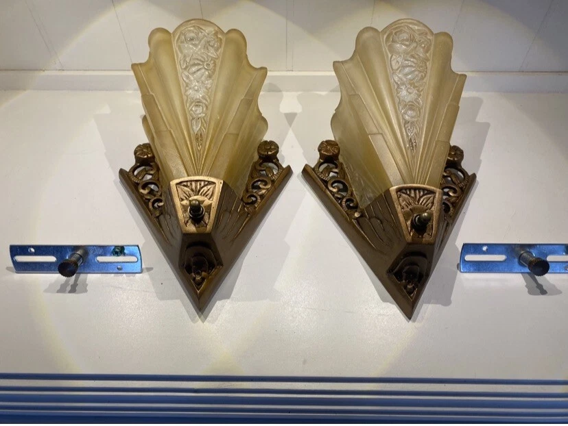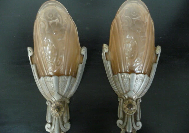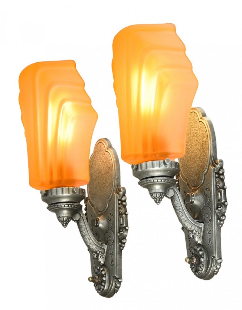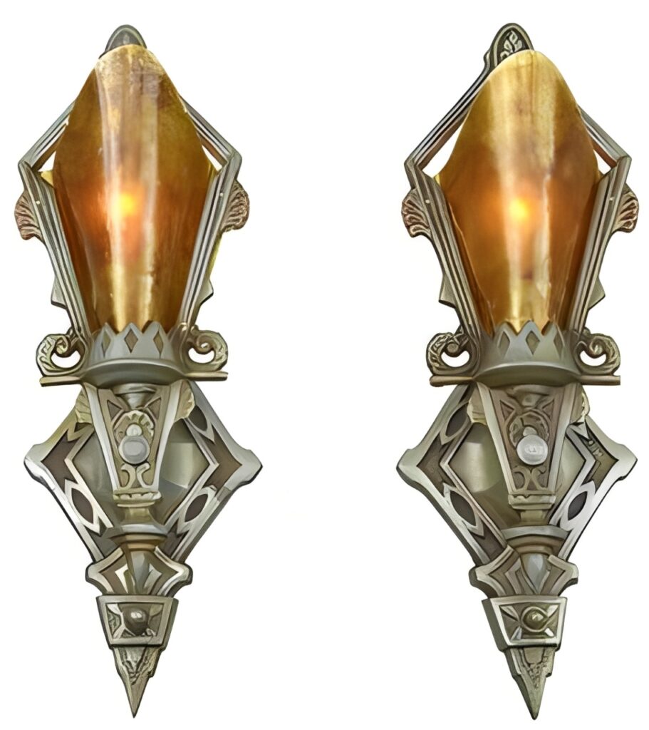 These sconces from the Art Deco era feature amber-colored glass shades adorned with detailed floral motifs, creating a warm and inviting atmosphere. The metal frames are designed with clean lines and a polished finish, highlighting the modern style of the time. These sconces were designed to not only light up a room but also to serve as decorative focal points. They have been rewired to meet modern electrical standards, making them safe and reliable for use today. Typically, a pair of these sconces is valued at approximately $395, offering an affordable way to introduce vintage style into your home.