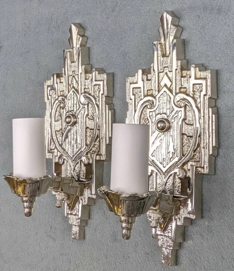These sconces were created by the Lincoln Lighting Company in the mid-1930s and feature intricate geometric designs and sleek metal frames. The slip shades, made of frosted glass, have a subtle pattern that adds to the Art Deco flair. Known for their durability and timeless design, these sconces were popular in homes and businesses alike. Rewired to meet modern standards, they are still safe to use while preserving their vintage charm. A pair of these sconces is typically priced around $550, making them a valuable addition to any collection.