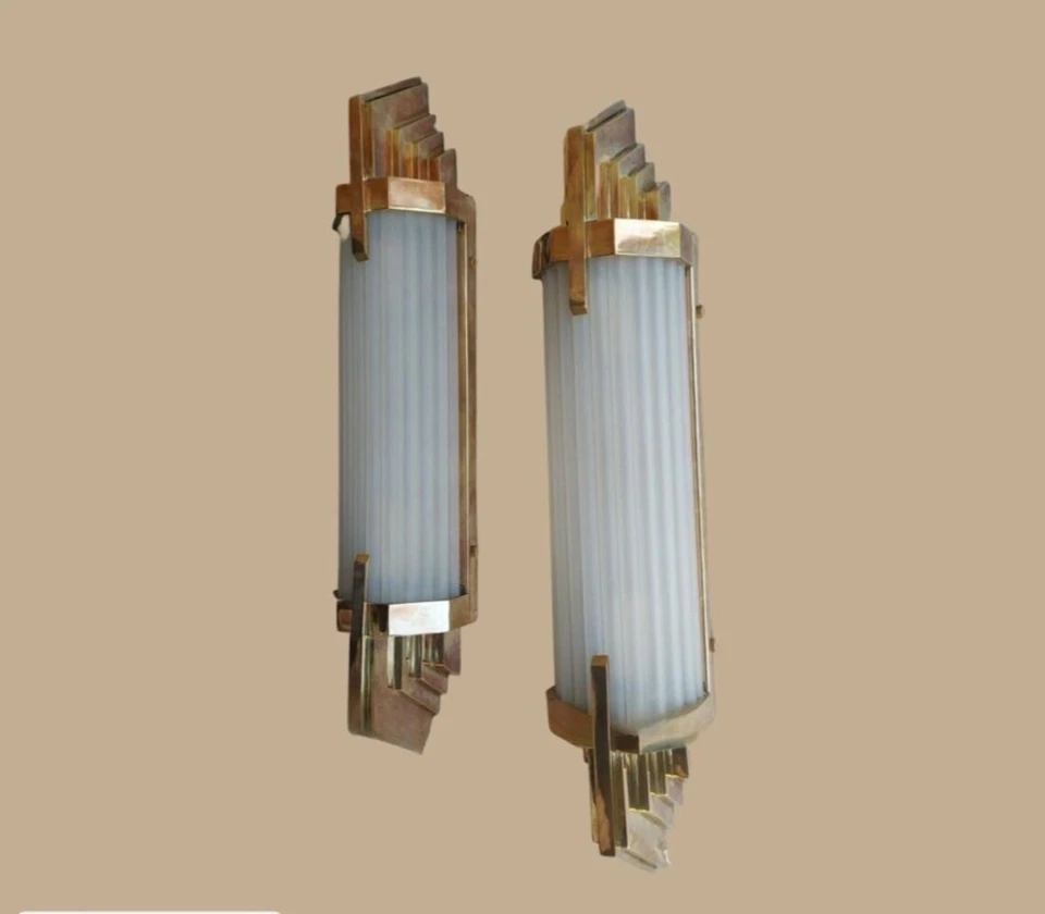 These Art Deco sconces feature frosted glass rods arranged in a geometric pattern, providing a stylish and diffused light. The metal frames are finished in a polished tone, complementing the sleek design of the glass elements. Designed to be both functional and decorative, these sconces make a bold statement in any room. They have been rewired for modern safety standards, ensuring both form and function. The price for a pair of these sconces typically ranges around $443, offering a high-end vintage lighting option at a reasonable cost.