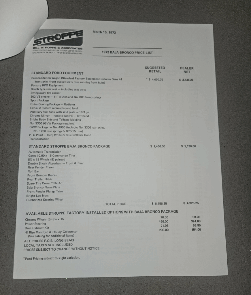 1972 Ford Bronco Dealer Price List Sheet