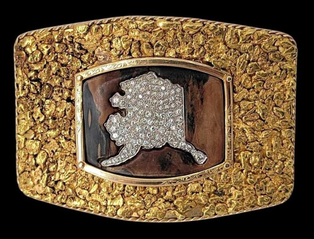 Made circa the 1970s, this buckle combines Alaska gold nuggets, mammoth ivory inlay and roughly 5 carats of diamonds. Its uniqueness comes from the exotic materials and the story tied to its origin in Alaska. An appraisal suggested its auction value could range between $20,000–$40,000 USD. The mix of gold, diamond and fossil ivory gives it appeal both as wearable accessory and as statement piece. Inspecting one means verifying gemstone quality, gold karat stamps and provenance of the mammoth ivory.