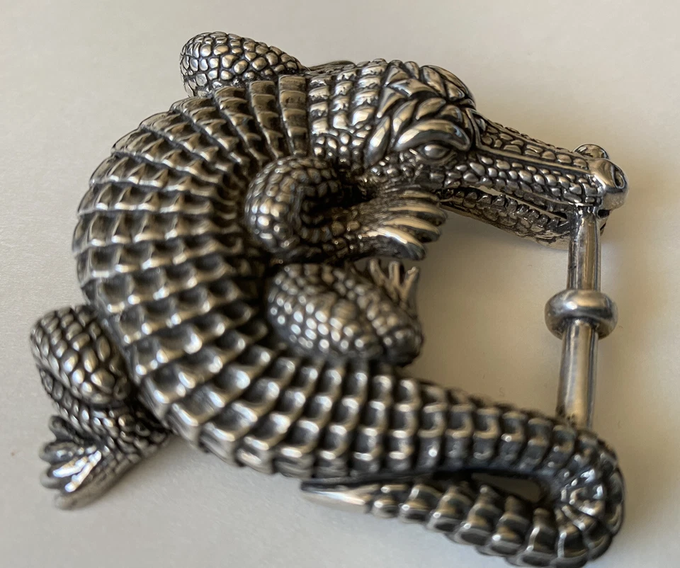 Circa 1980s–90s, this buckle features sterling silver with hall-marks and figure motifs (for example alligators or horses). What raises interest is the designer signature, high silver content and limited production. Auction records show these sell for a few hundred to several hundred dollars depending on design – for example, one sold around $425 USD. Condition matters a lot: look for original finish, minimal wear and full weight (no trimmed edges). The presence of the designer mark and original leather strap can push value upward.