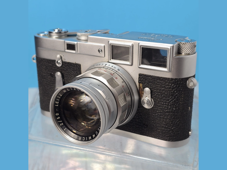 The lens is known for its soft bokeh and beautiful color rendering, making it a favorite for street and portrait photographers. The camera body itself is simple, with minimalistic design, allowing the photographer to focus entirely on the subject. The current market value for a Leica M3 with this lens can range between $2,000 and $3,500, depending on condition and included accessories.