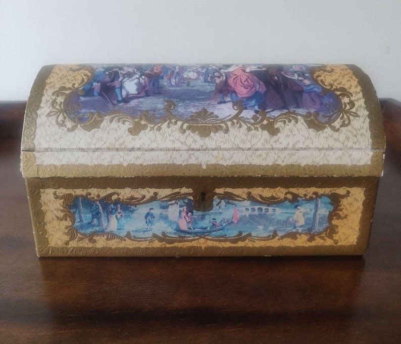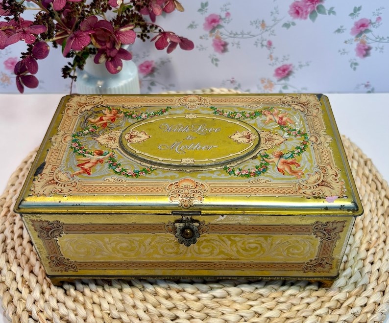Many of these tins were reused after the candy was eaten, which means vintage examples often show wear or repurposing. Items that still have their original lid-art, original hinges, and correct era labelling are especially sought. The connection to an established brand and a decorative tin rather than plain cardboard gives these boxes staying power. When you are considering one check for authenticity of the lid art, whether the box has been polished or repainted (which lowers value), and if it still closes properly. For someone interested in vintage confectionery packaging this kind of piece holds more collectible appeal than the sweets that were inside.