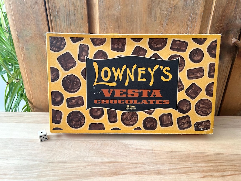 Lowney’s of Brockton, Massachusetts produced a Vesta chocolate box in the 1920s which is now sought after by collectors of vintage candy packaging. The distinguishing feature is the box’s early 20th-century artwork and branded design that reflect the era’s marketing style. Because very few of these boxes survive with their original artwork intact, they are often more valuable than the candy they once held. Presently one in good condition might sell for approximately US$120 to US$240. The box appeals to those who appreciate early advertising and confectionery history.