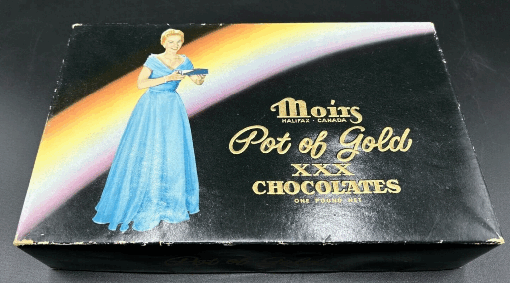 Moir’s chocolates in Canada issued a Pot of Gold XXX boxed assortment in the 1950s. The decorative box is more collectible than the candy that was inside. The decorative motif and Canadian origin give it a special place among North American chocolate packaging items. Because fewer of these Canadian boxes remain in good condition, they often carry value beyond the sweet originally sold. A clean box could command around US$90 to US$200 today. The box appeals to Canadian confectionery collectors and packaging historians.