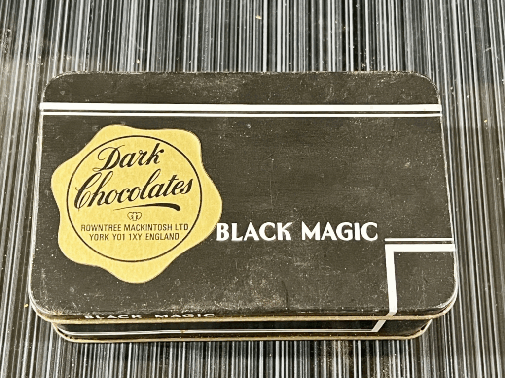 The Black Magic boxed chocolates were introduced in the UK by Rowntree’s in 1933 and some early tins from the 1930s reflect throw-back presentation styles. What makes the tin interesting is the original advertising theme and graphic design of the era, including lithographed imagery that remains collectible. Because the tin packaging was premium and few survive with perfect graphics, these items usually carry a higher value than the chocolates themselves did. Market value for a good intact tin from that period can range from US$150 to US$300. The tin appeals to those who collect chocolate memorabilia or vintage tins.