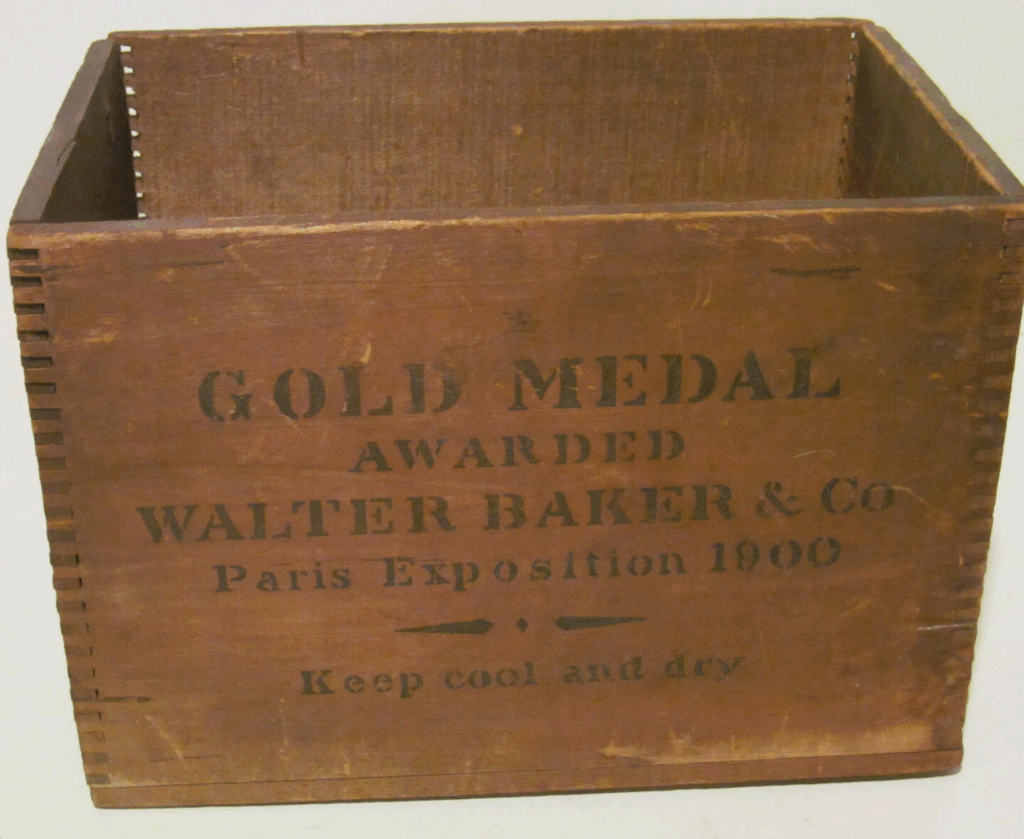 Walter Baker and Co produced premium chocolate and issued a wooden crate or box around the early 1900s which has since become a collector’s display piece. The feature of note is the wooden construction and the branded metal plate or embossing which make it far more durable and collectible than typical cardboard packaging. Because very few of these wood-branded boxes survive undamaged, they are more valuable now than the candy they once held. Market estimates for one in good display condition might reach US$300 to US$500. The wooden box appeals to collectors of early confectionery and industrial design.